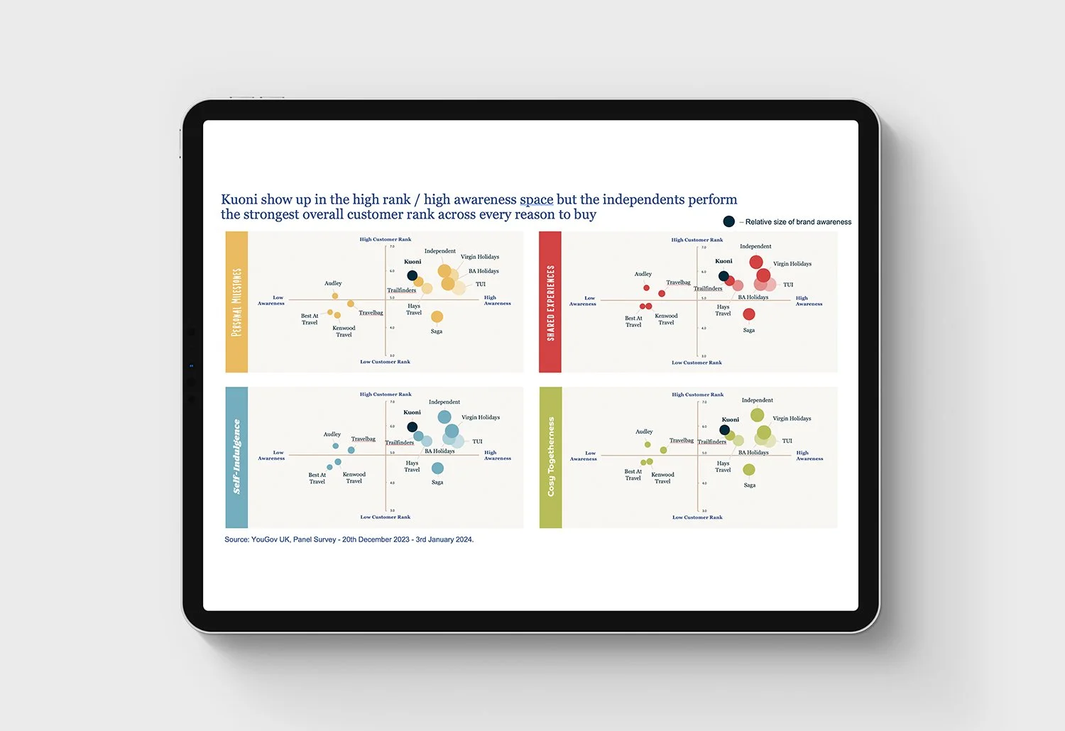 We worked in partnership with Kuoni to develop their Consumer-Led Growth programme empowering teams to identify high-value segments and overcome consumer barriers to booking premium travel. Using real-time consumer insights and ‘Jobs to be Done’ thinking, the programme encourages users to define ‘Must Win Battles’ and reframe holidays as essential self-care. The programme led to a clear strategic direction, elevating Kuoni from trusted service to an iconic, emotionally resonant brand.